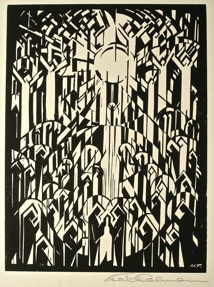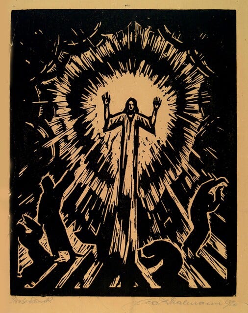 When an artist prepares a woodcut, they cut away part of a block of wood, leaving the rest of the surface to be covered in ink and then pressed like a stamp into a sheet of paper. The artist could cut away everything except for a circle, which would leave a circular stamp of ink in the finished product, or they could cut out the circle in the block and the circle would be the only part of the paper that isn’t stamped by the ink on the wood. Thelmann’s piece here uses only black ink, and Christ, the hills, the sun and clouds, are all pressed black into the paper. This simple technique allows the artist to suggest to us the bleakness of the day of Christ’s crucifixion. This poem should linger in that imagery, while still suggesting that that’s what Christ wanted. That the darkness was worth it, because we were worth it.